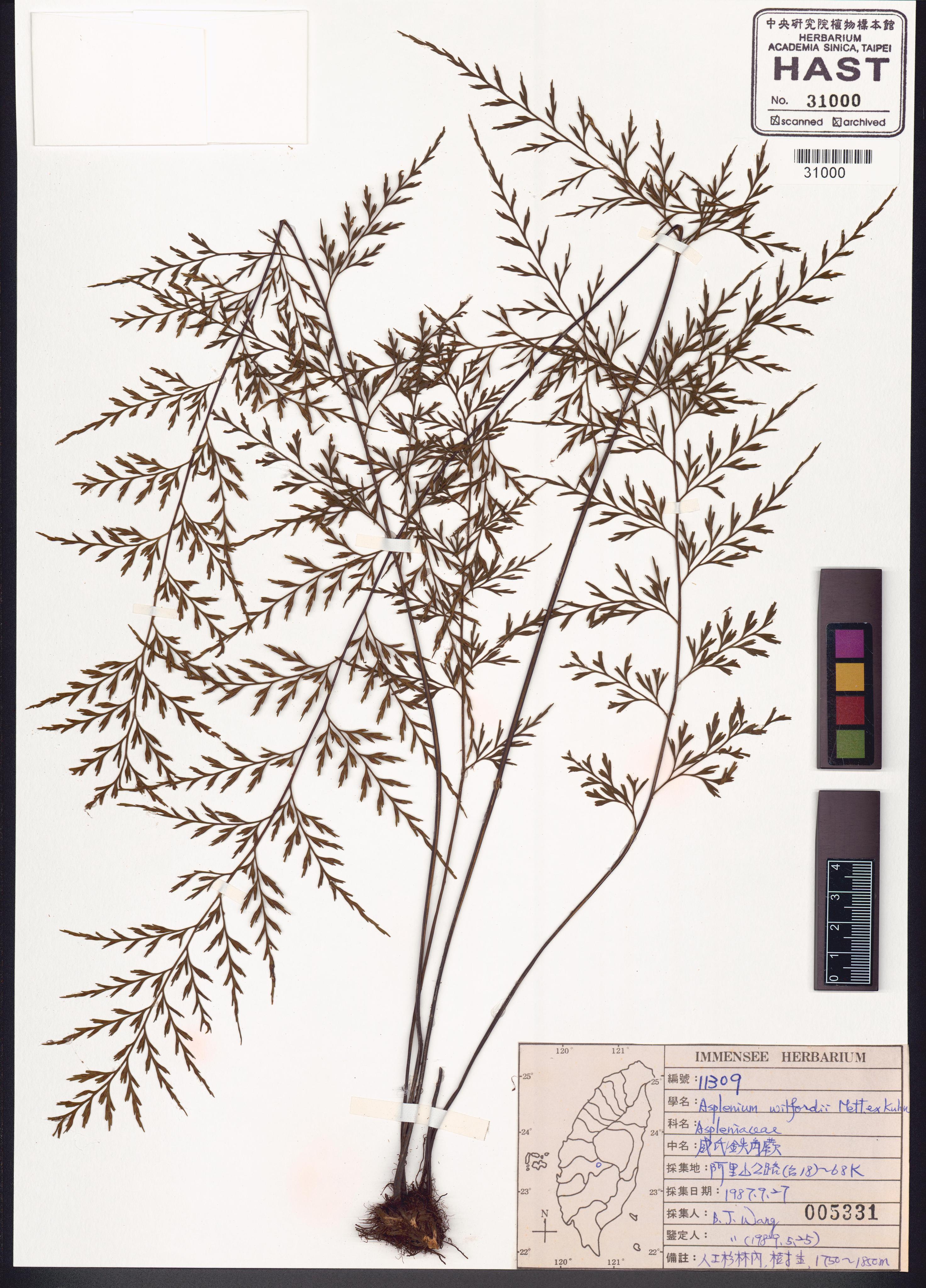 | 1 | Asplenium wilfordii Mett. ex Kuhn. | 威氏鐵角蕨 | Wang, Bi-Jao (王弼昭) | 1989-05-25 |