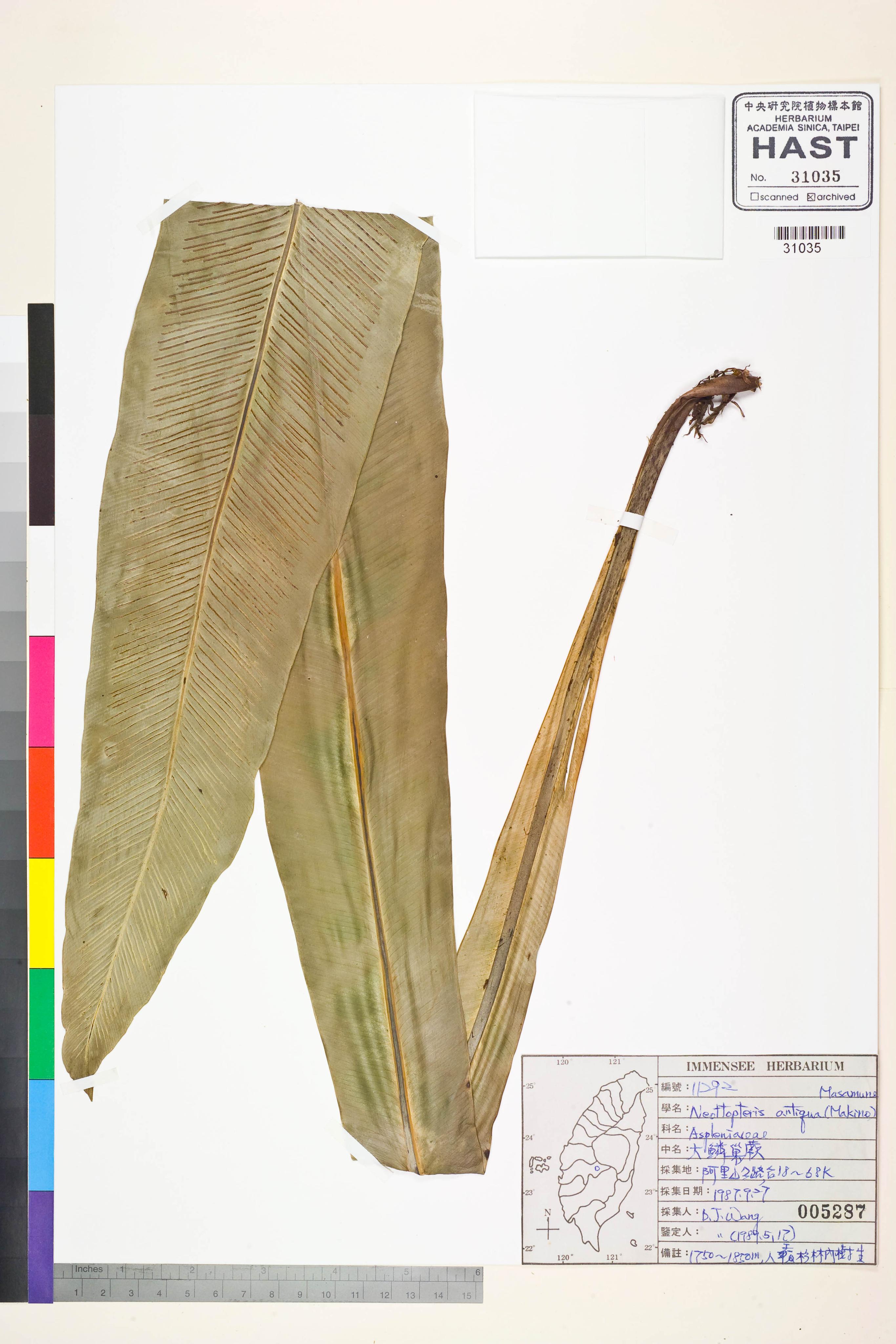 | 1 | Neottopteris antiqua (Makino) Masam. | Wang, Bi-Jao (王弼昭) | 1989-05-17 |