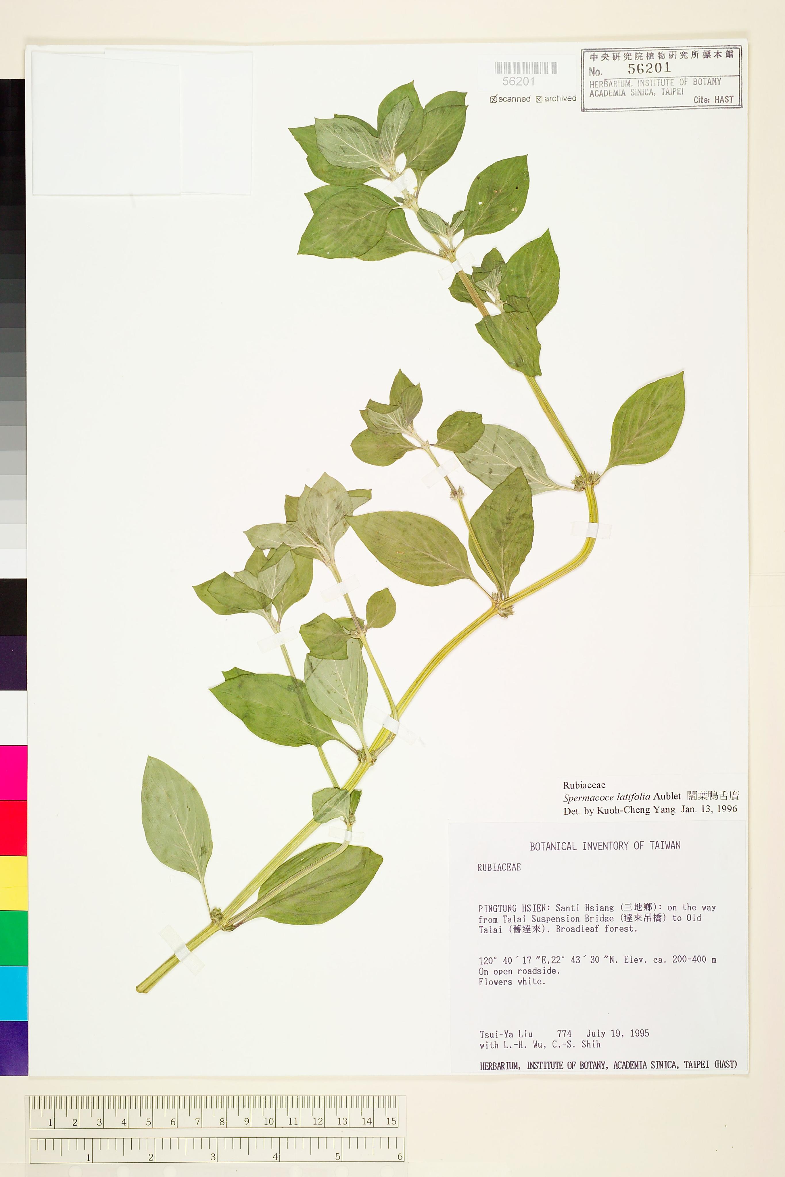 | 1 | Spermacoce latifolia Aubl. | 闊葉鴨舌廣舅 | Yang, Kuoh-Cheng (楊國禎) | 1996-01-13 |