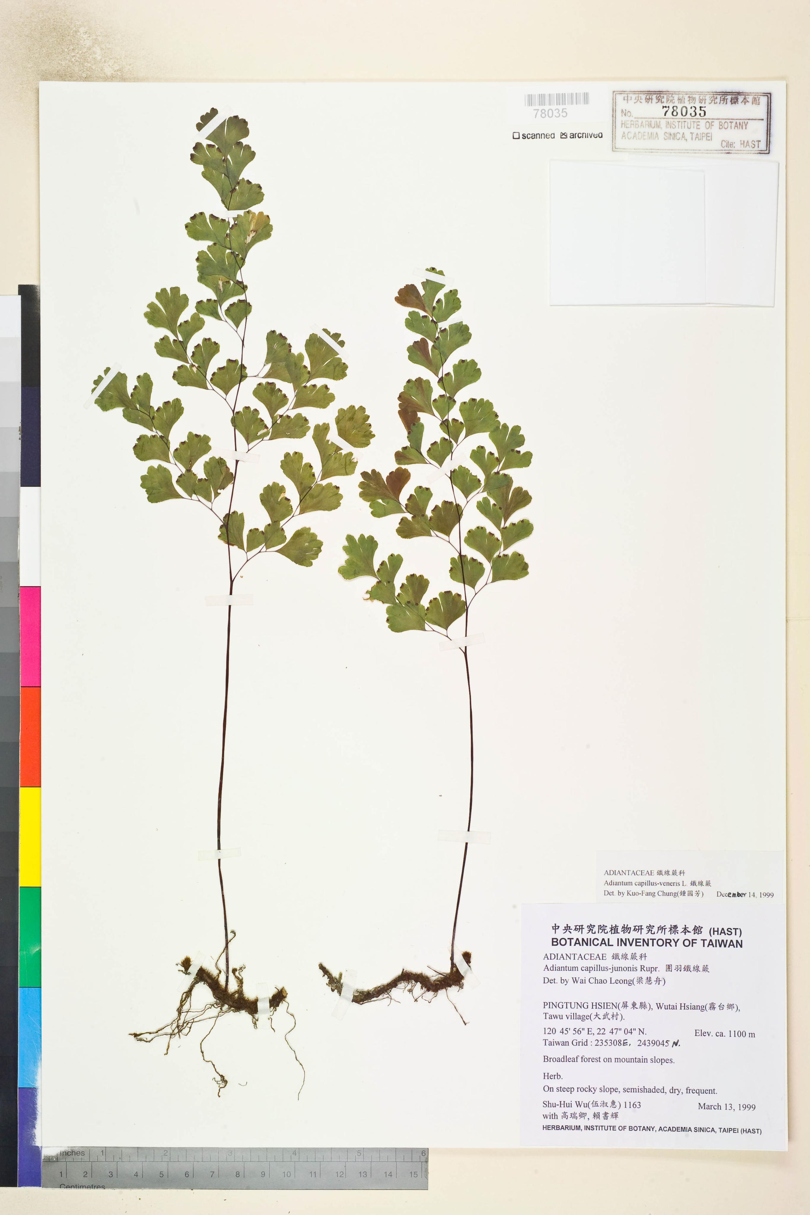 | 2 | Adiantum capillus-veneris L. | 鐵線蕨 | Chung, Kuo-Fang (鍾國芳) | 1999-12-14 |