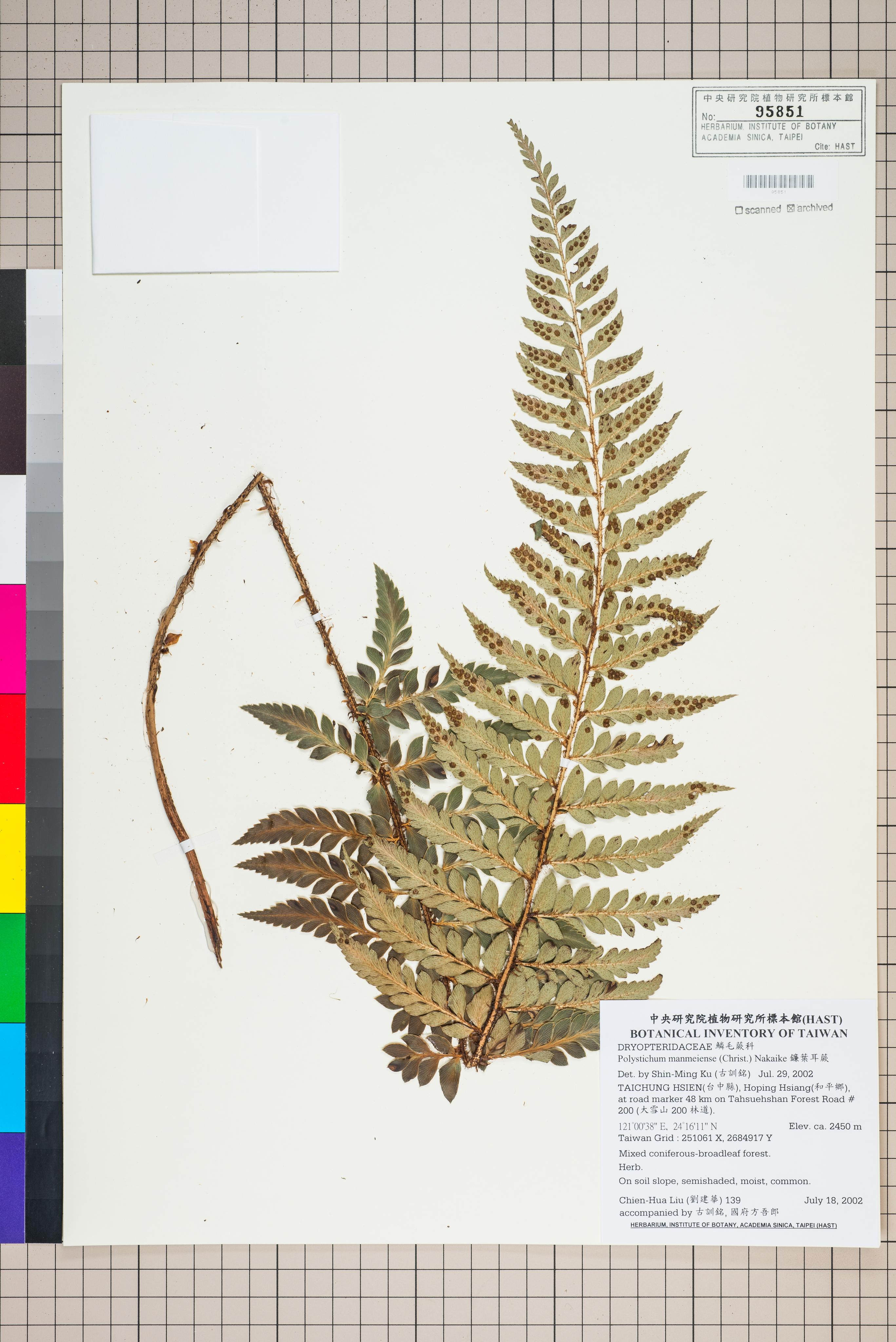 | 1 | Polystichum manmeiense (H. Christ) Nakaike | 鐮葉耳蕨 | Ku, Shin-Ming (古訓銘) | 2002-07-29 |