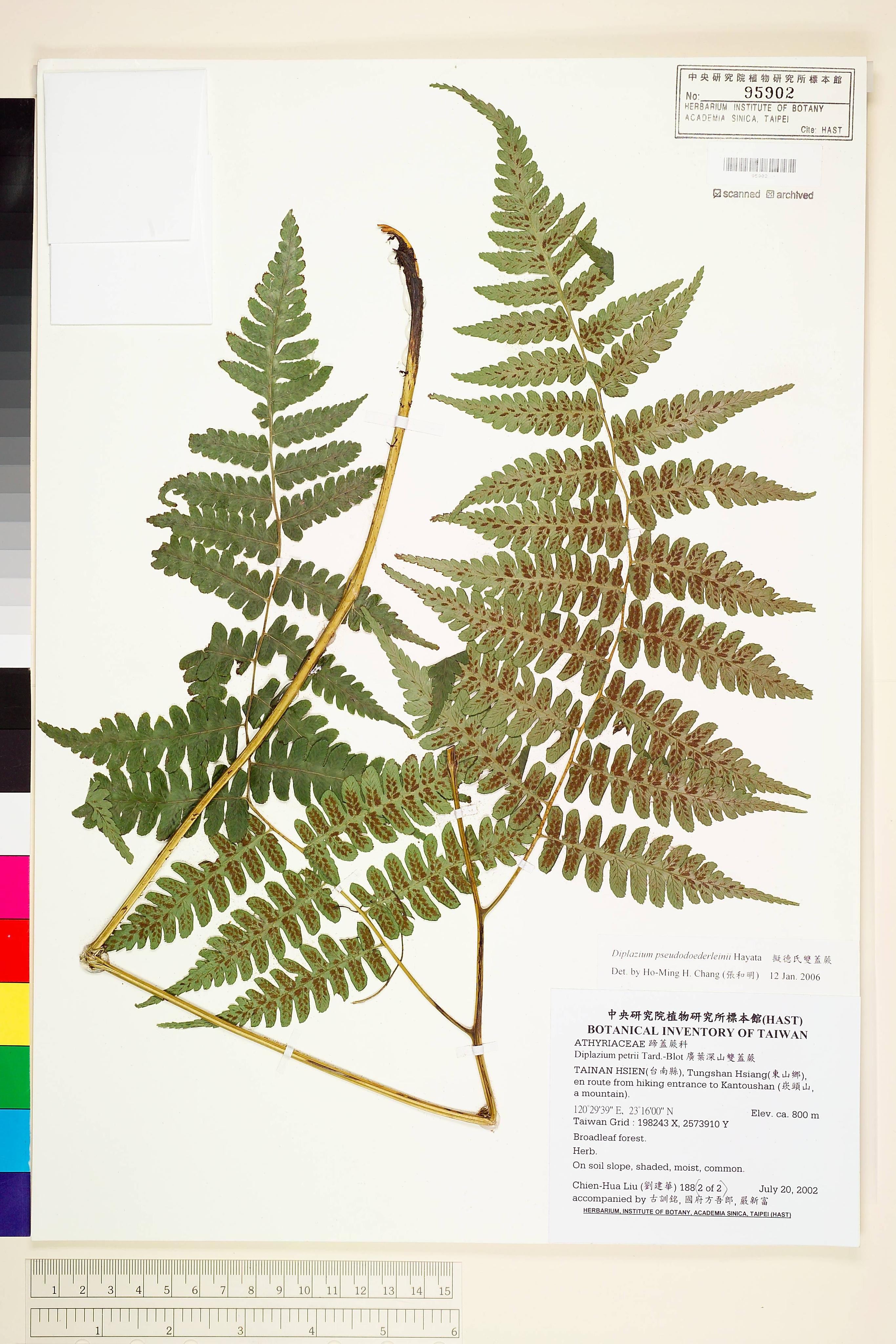 | 1 | Diplazium pseudo-doederleinii Hayata | 擬德氏雙蓋蕨 | Chang, Ho-Ming H. (張和明) | 2006-09-12 |